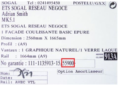 Votre numéro de garantie est indiqué sur une étiquette collée à l'arrière des portes de placard, sur le colis de vos aménagements dressing et dans le colis séparations de pièces.