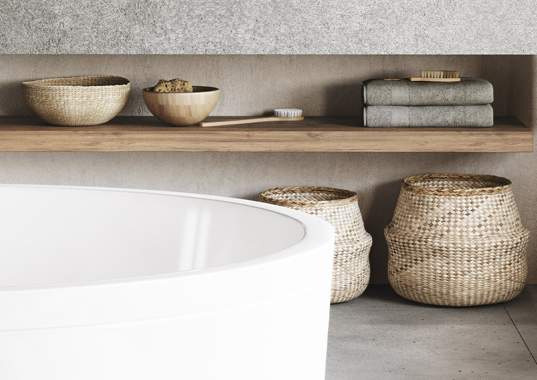 Autorisez-vous une pause et laissez la douce ambiance du Japon vous envelopper. Retrouvez l’apaisement en donnant à ce moment du bain son côté reposant. Faites de votre salle de bain privative une vraie bulle de sérénité et offrez-lui le meilleur. Célébrez les matières ! Un décor cuir sur les montants du placard procure à votre pièce à la fois force, rigueur et douceur. Des paniers tressés en bambou apportent la note féminine et naturelle. Enfin, la céramique sous les vasques donne l'aspect minéral, brut et authentique.