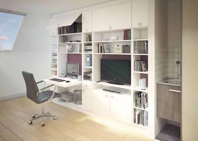 Un plan de travail où couper ses légumes, des placards avec étagères pour ranger vaisselle et aliments, des tiroirs où stocker casseroles et électroménager, un évier incorporé dans une table bar… Une petite cuisine même, et surtout, dans un studio doit être fonctionnelle, ergonomique, pratique et faire place nette ! Ici, les meubles sur-mesure Sogal® Intérieurs offrent une discrétion totale grâce aux façades des portes de placard sans poignées, tout en offrant une grande contenance de rangement. L’agencement des meubles sur-mesure permet une exploitation totale de l’espace cuisine.