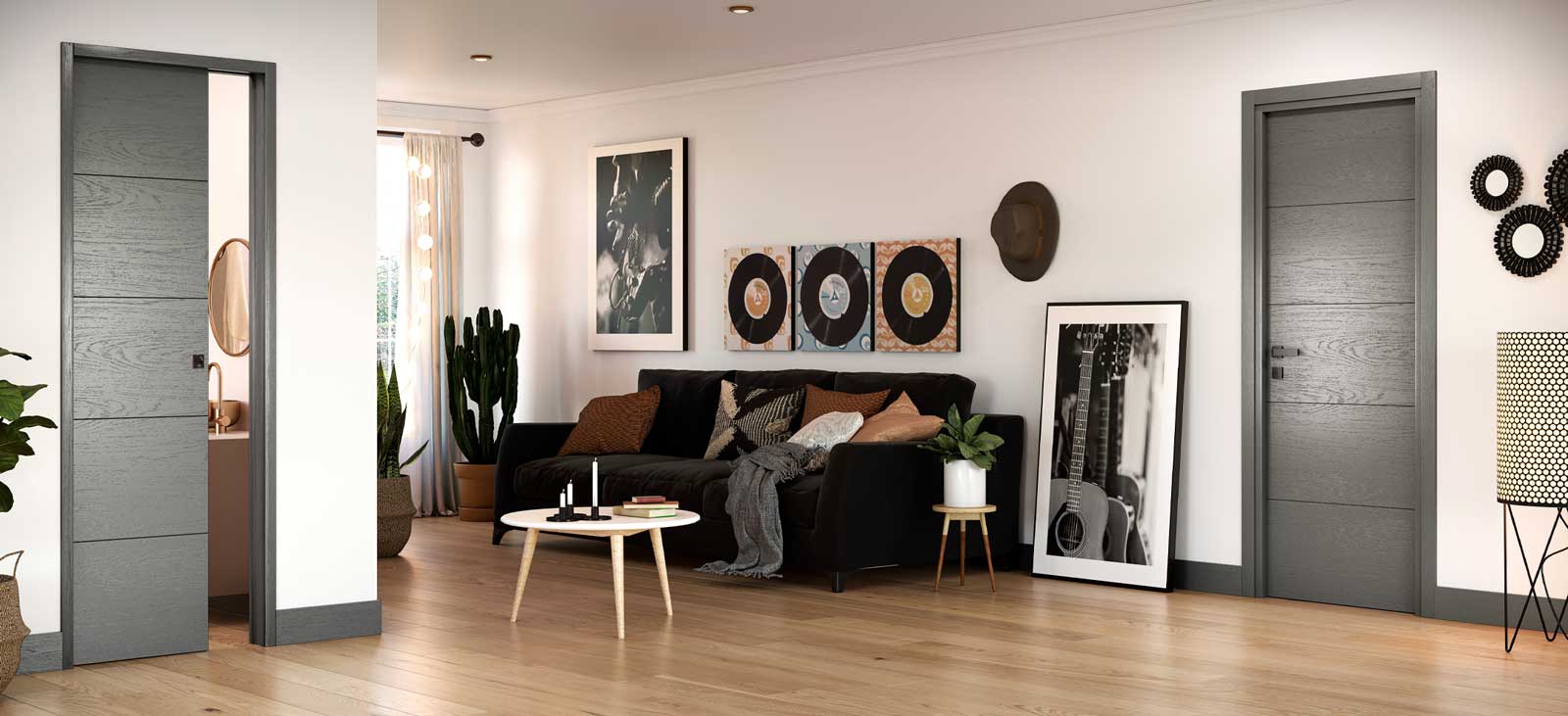 Le veinage grisé des portes battantes et coulissantes qui s’opposent apporte un équilibre à l'esprit décoratif de la pièce. Discret, ce revêtement s'accorde parfairement avec un carrelage gris. Il laisse la mise en lumière aux meubles design et à la décoration soignée, tout en apportant une touche naturelle d’élégance.